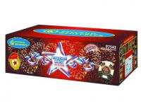 Эффект: 12 эффектов: 1-2. Выстреливает подряд: Зелено-фиолетовые звезды с пышными хвостами (кокос) и золотое мерцание. Серебряные звезды с пышными хвостами (кокос), зеленое мерцание и фиолетовые звезды. 3-4. Выстреливает подряд: Множество золотых ниспадающих нитей (парча) с красными звездами на концах и треск (трещащий дождь). Множество золотых ниспадающих нитей (парча) с зелеными звездами на концах и треск (трещащий дождь). 5. Веер W- формы: По краям - красные кометы, в центре - красные звезды с пышными хвостами (кокос), зеленые звезды и белое мерцание 6. Веер. 2 уровня: Внизу - сине-белый букет. Вверху - красно-зеленые и трещащие букеты падающих звезд (падающие листья). 7. Множество серебряных ниспадающих нитей (парча), красно-синяя сфера (пион) и белое мерцание. 8. Сфера золотых хвостов с переходом в красно-зеленые звезды (цветная хризантема). 9. Веер W-формы: По краям - серебряные кометы с хвостами, в центре - множество серебряных ниспадающих нитей (парча) и красно-зелено-синяя сфера (пион). 10-11. Выстреливает подряд: Красные звезды с пышными хвостами (кокос), зеленые звезды и облако трещащих разрывов (трещащий дождь). Зеленые звезды с пышными хвостами (кокос), фиолетовые звезды и облако трещащих разрывов (трещащий дождь). 12. Красочная концовка: множество серебряных ниспадающих нитей (парча) и синие звезды. (100-120 сек., до 45 м)