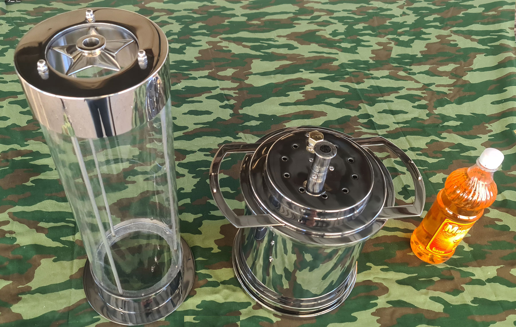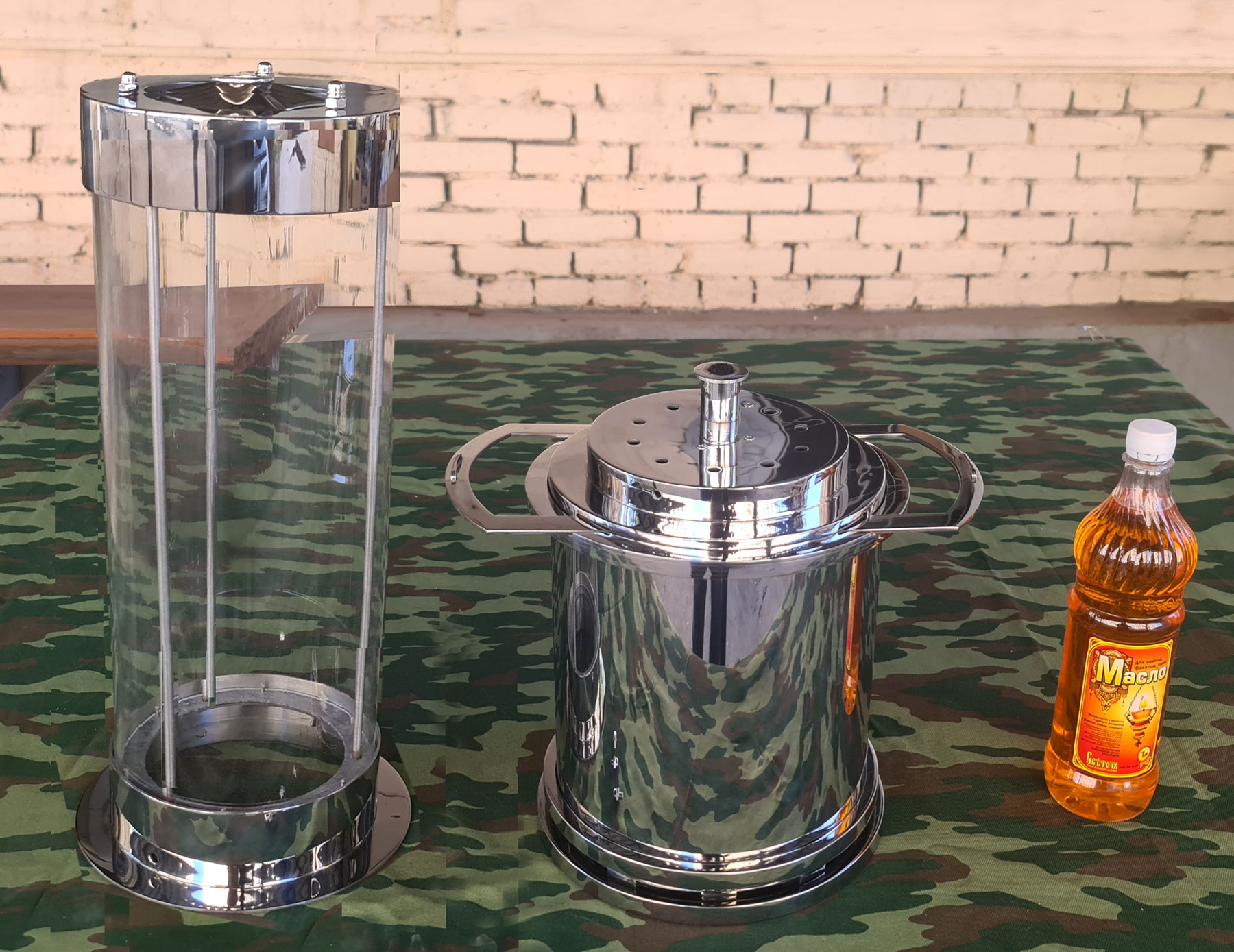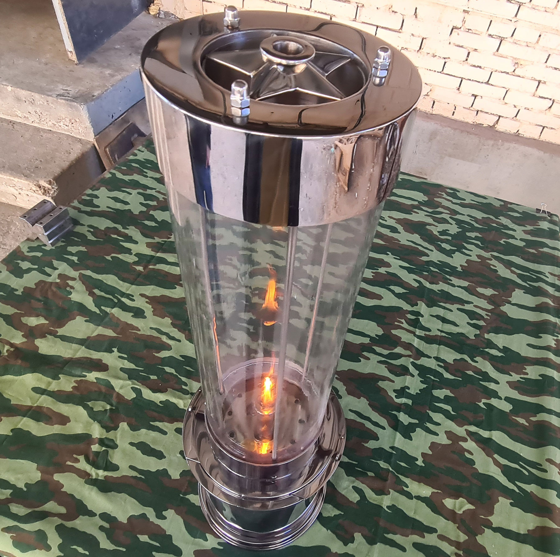 Материал изделия – полированная нержавеющая сталь AISI304 с толщиной стенки не менее 2 миллиметров. Высота капсулы по центральной оси 800 миллиметров, диаметр по наибольшему замеру 250 мм, диаметр стеклянной колбы 170 мм. Вес изделия 7,5 килограмм.