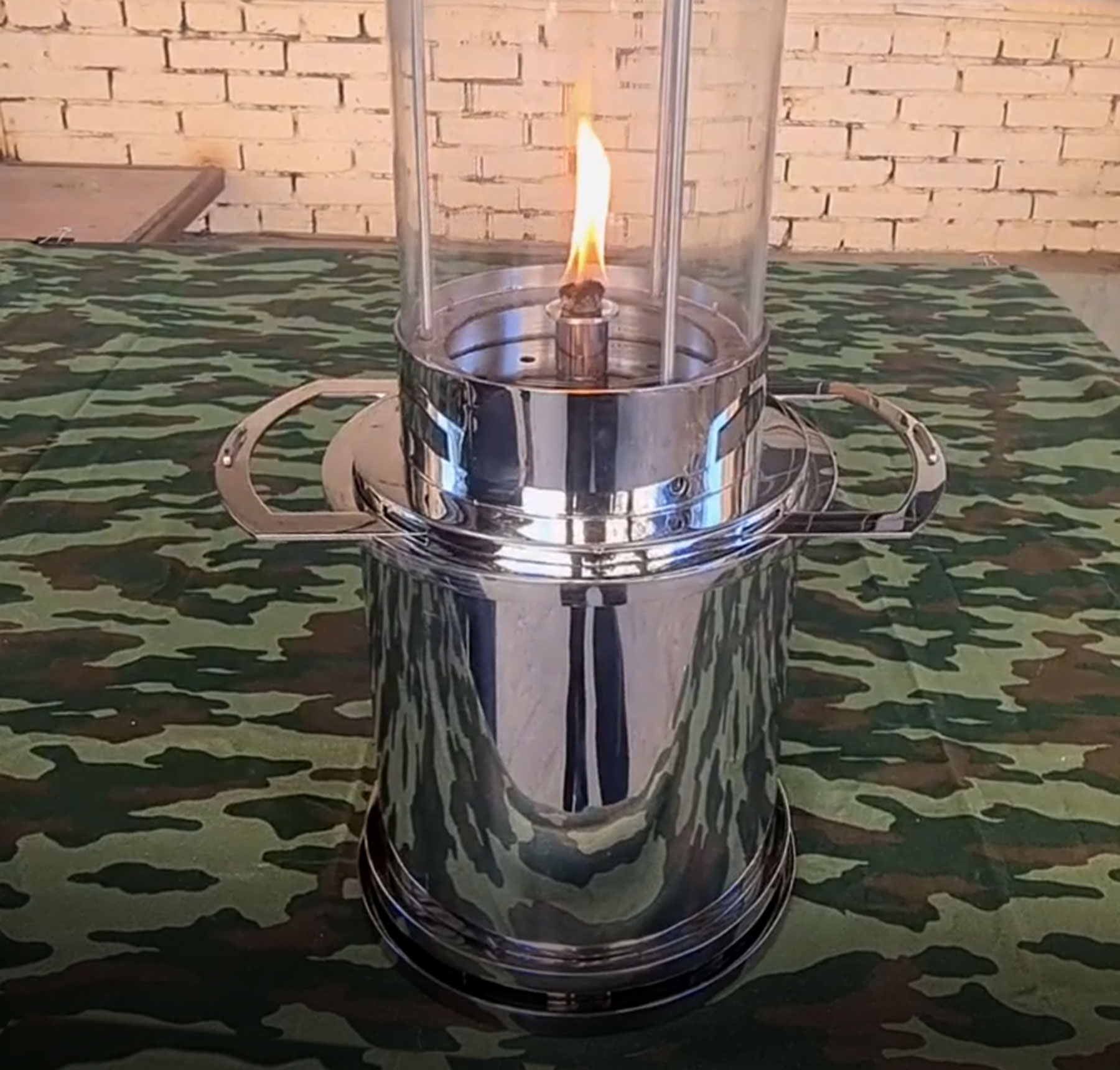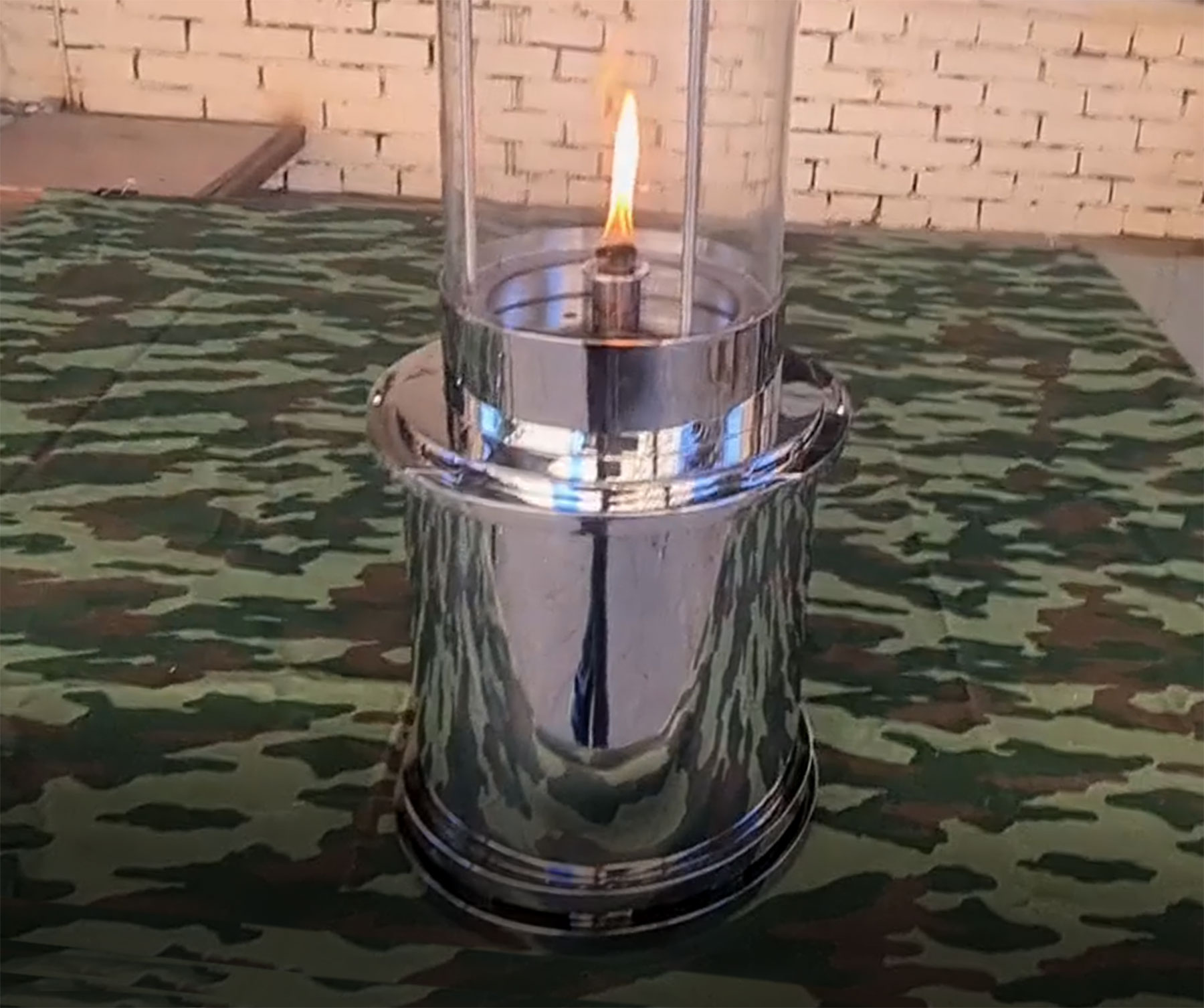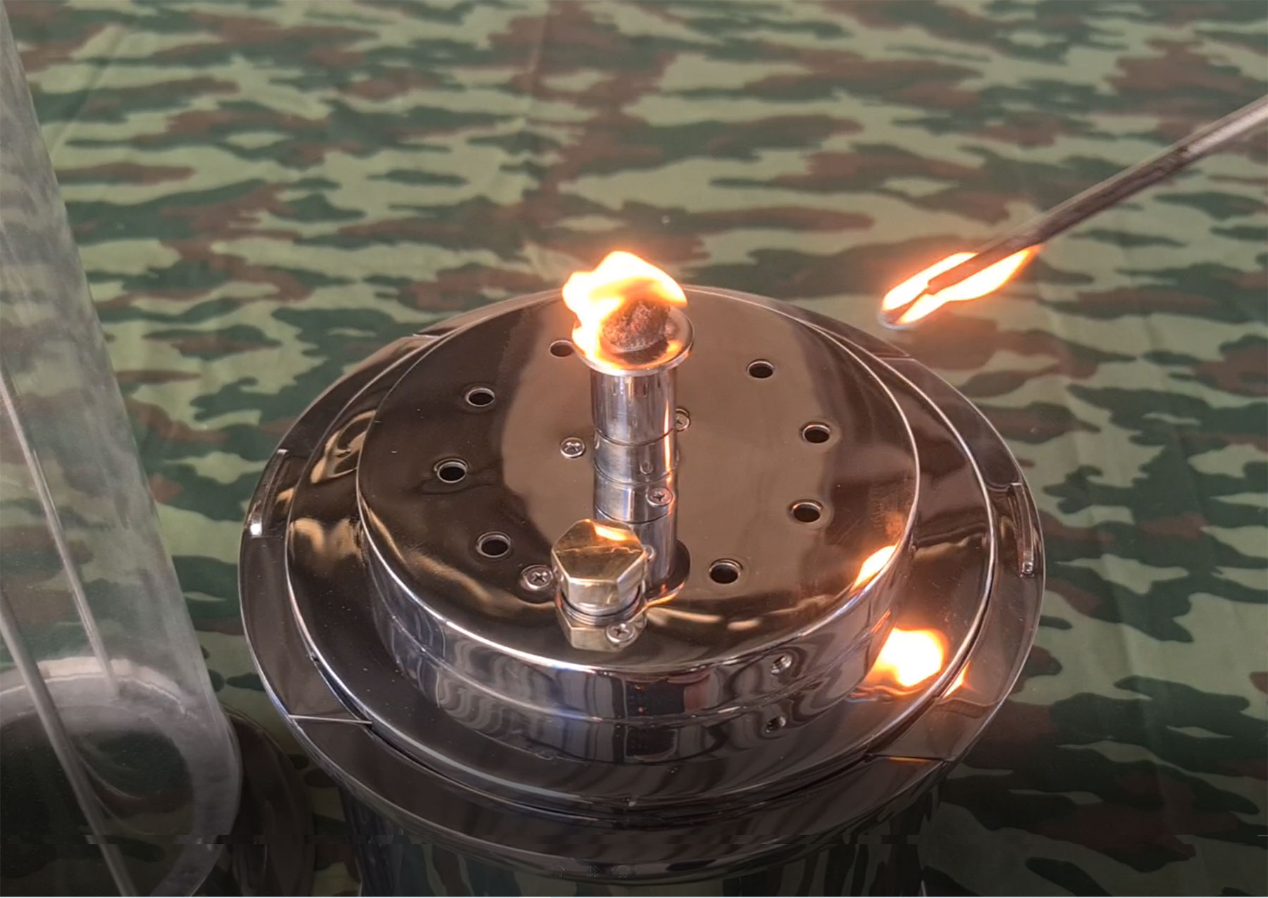 Светильник хорошо работает на топливе для заправки масляных ламп низкой температурой языка пламени. Норма заправки топливной ёмкости 1,5 литра горючей жидкости, расход топлива - 15 грамм в час, при нормальной высоте пламени, около 3 сантиметров. Светильник для хранения и перевозки вечного огня комплектуется лучинкой для забора и розжига пламени.