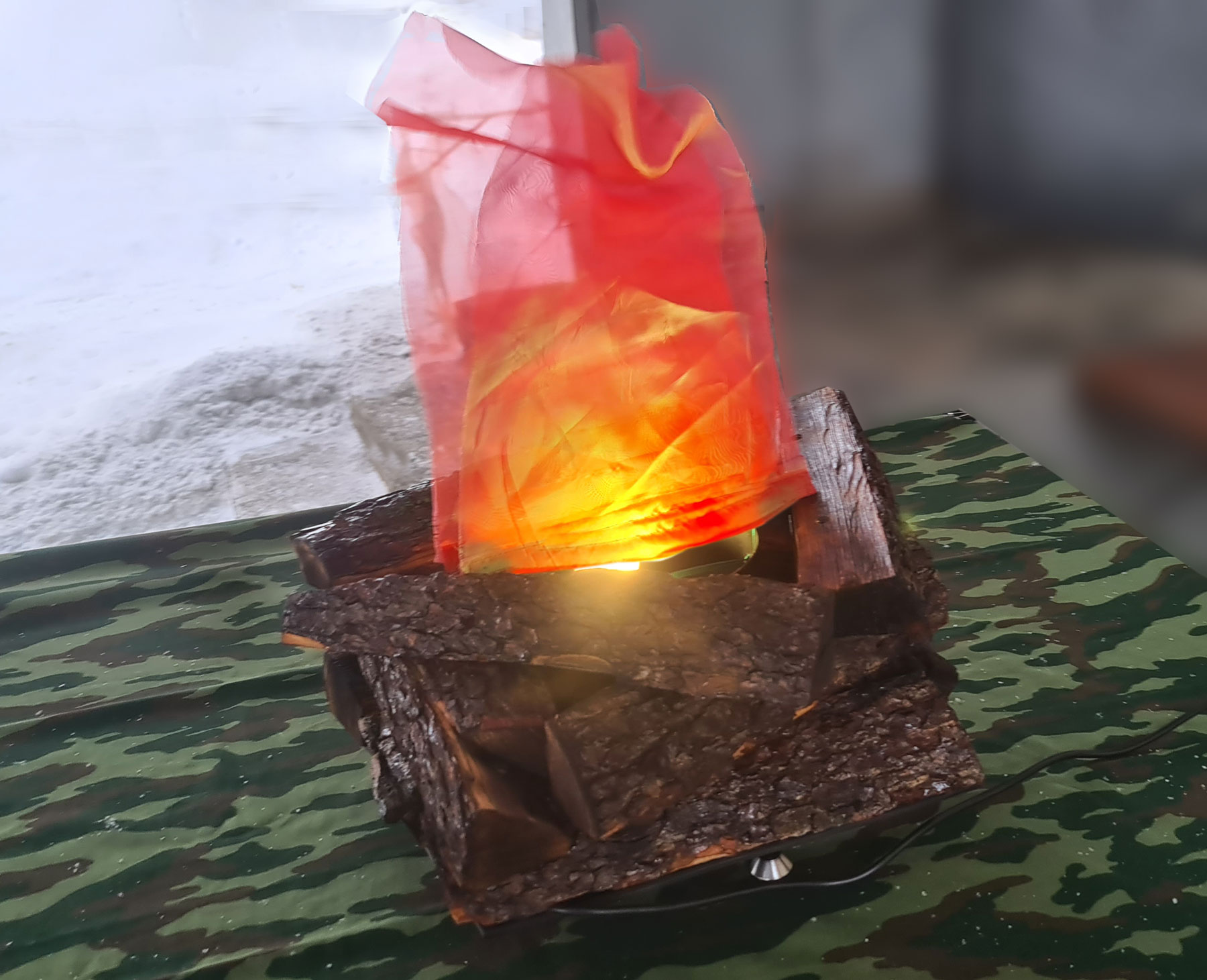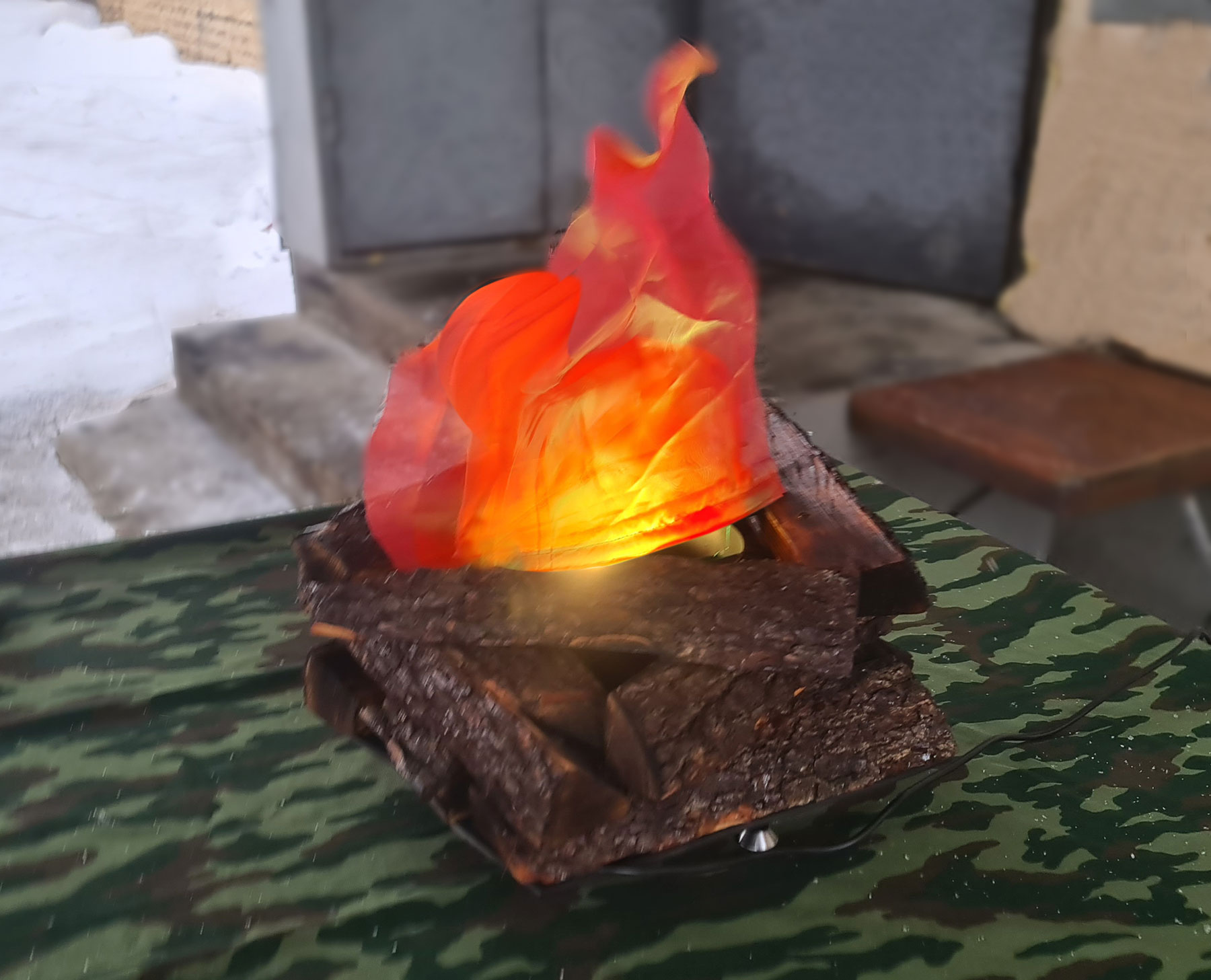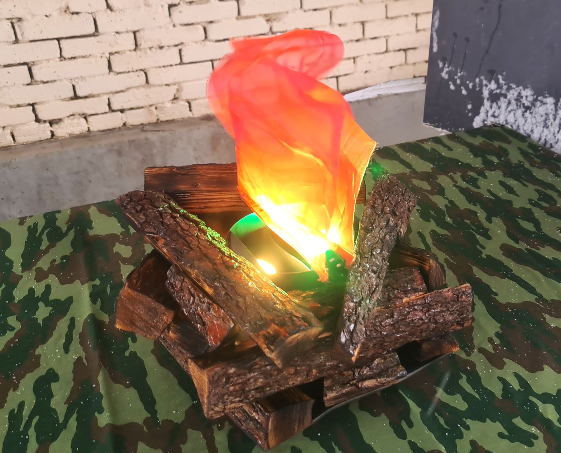 - Вентиляторы: небольшие вентиляторы, скрытые в конструкции, создают лёгкие движение ткани, имитируя колебания пламени от ветра.