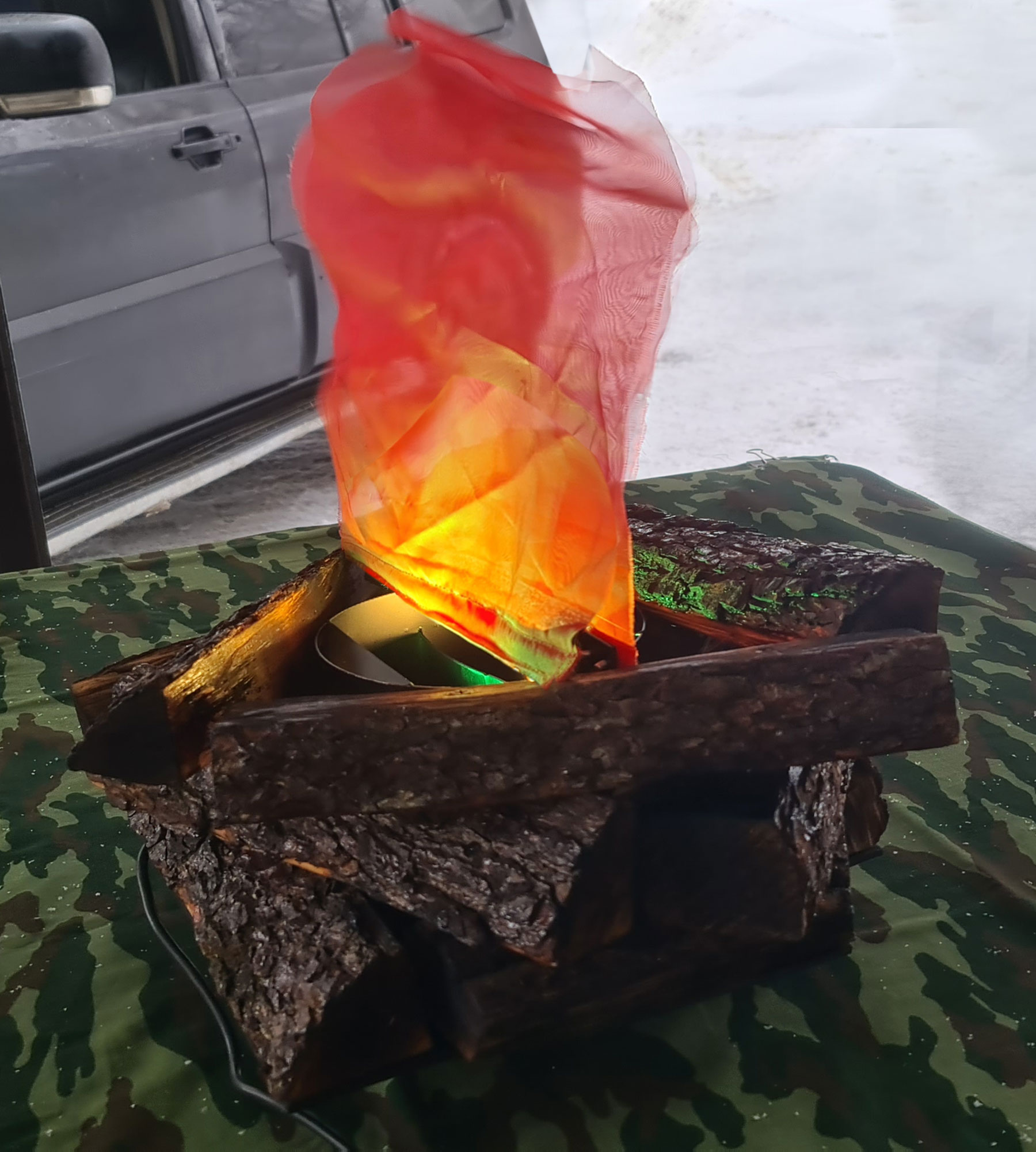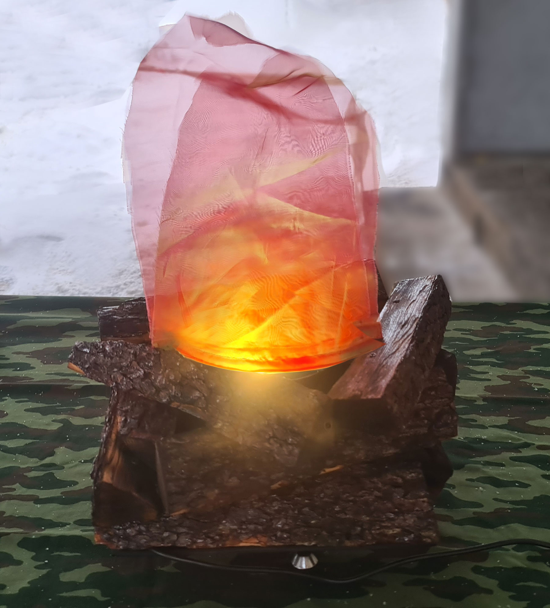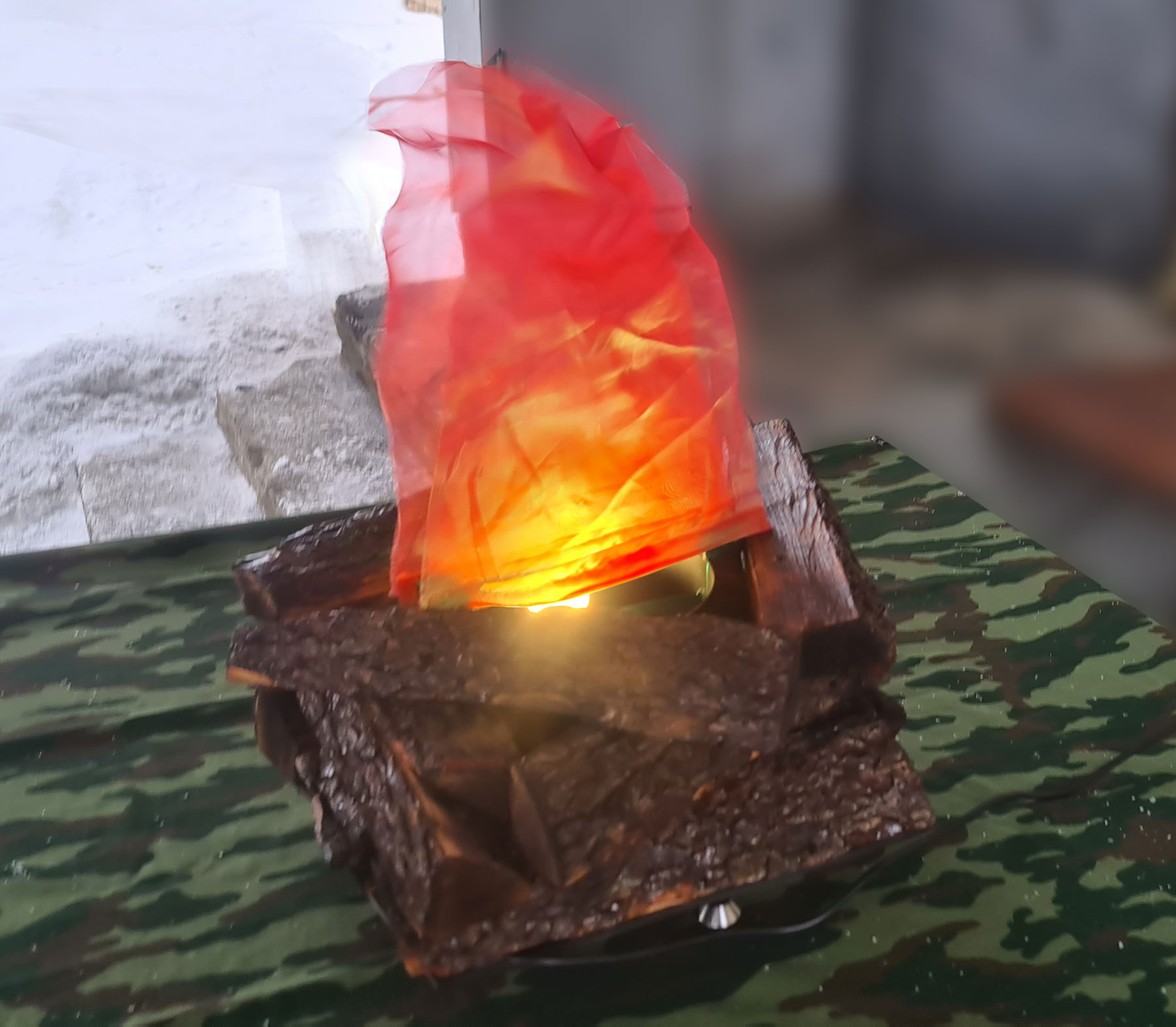 - Вентиляторы: небольшие вентиляторы, скрытые в конструкции, создают лёгкие движение ткани, имитируя колебания пламени от ветра.