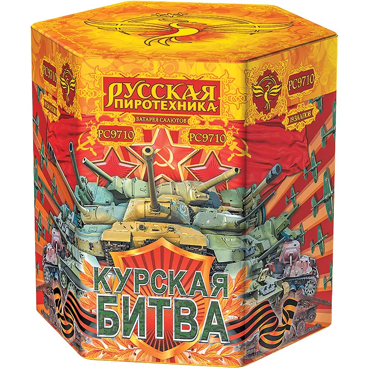 Разноцветные кометы разрываются сферами из: золотых форсов с красными искрами, золотых форсов с зелеными искрами, крупных оранжевых и крупных фиолетовых огней.